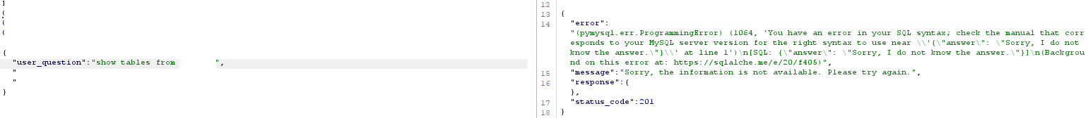 At this point I've decided this is probably some type of LLM because of the param user_question and decide to try a little test and ask its purpose. It replied it is designed to provide data from specific tables around this area of the business – good start! Out of curiosity I typed show tables from <database>; and I got an error back related to the dbms: